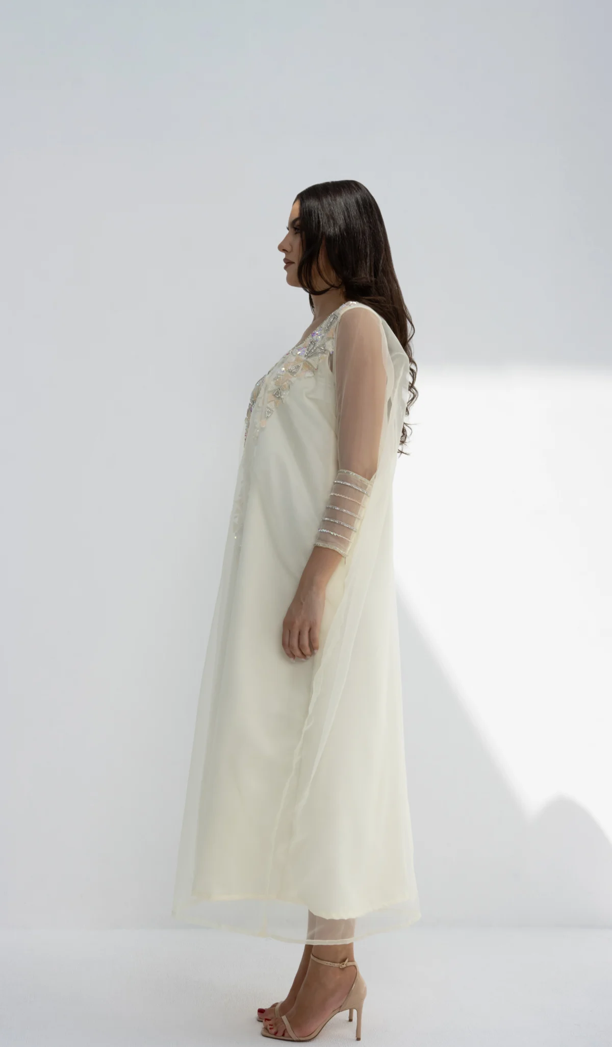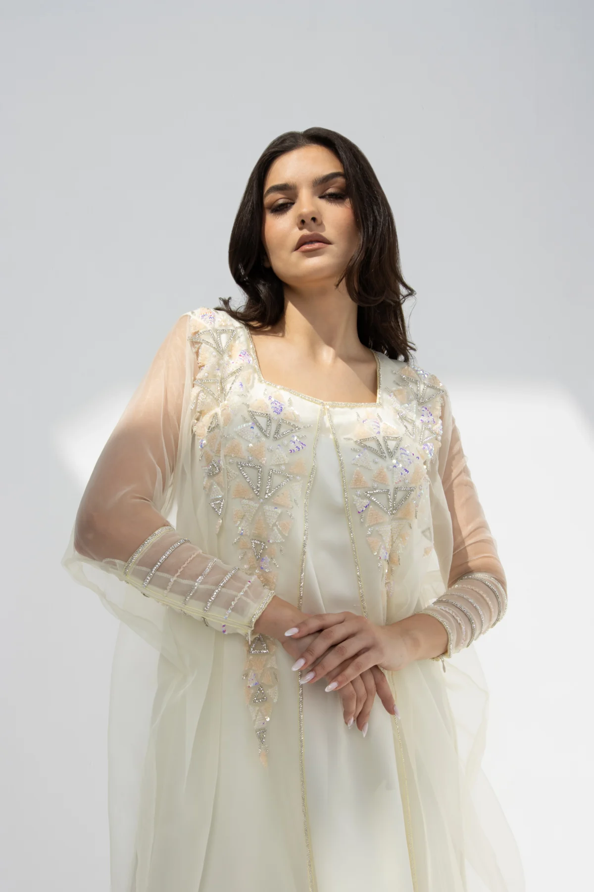 مزين بـ خرز فضي لامع وفاخر مع تطريز دقيق على الصدر والأكمام.