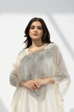 التفاصيل: مزين بخرز فضي لامع وتطريز دقيق على الصدر والأكمام
