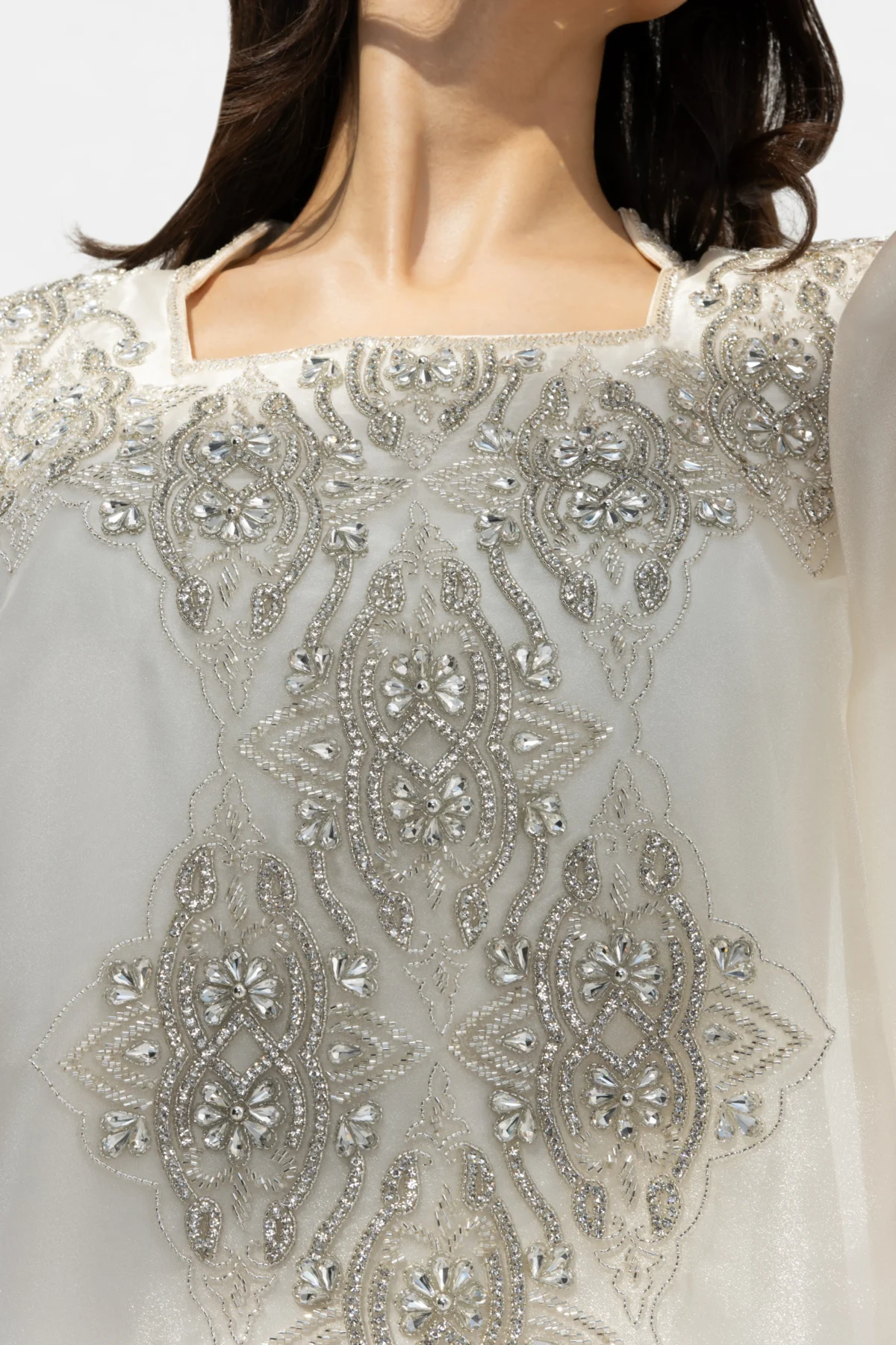 التفاصيل: مزين بخرز فضي لامع وتطريز دقيق على الصدر والأكمام