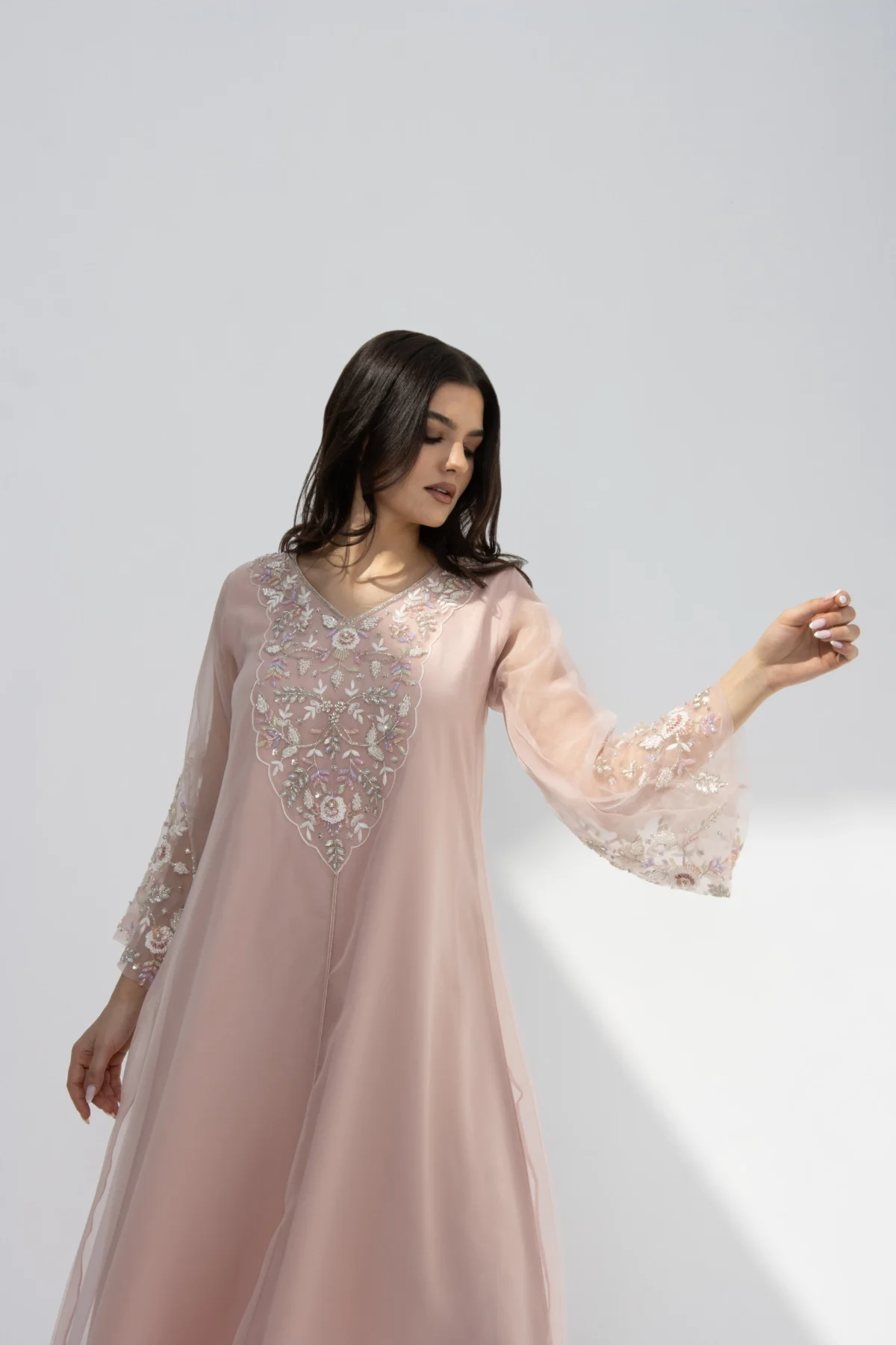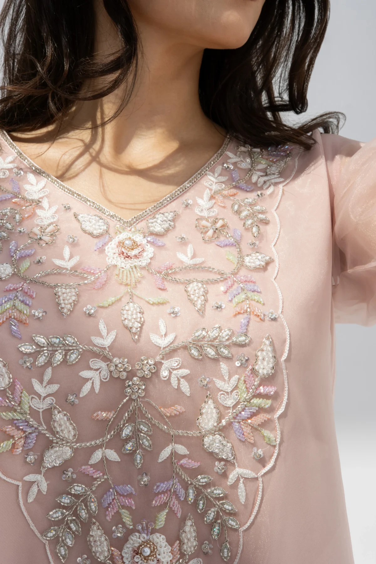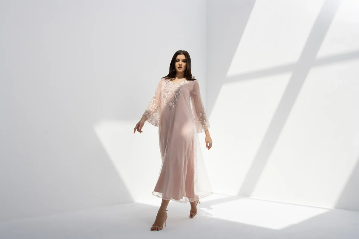 تصميم مزخرف بـ خرز فاخر يزين الصدر والأكمام بأسلوب أنثوي راقٍ